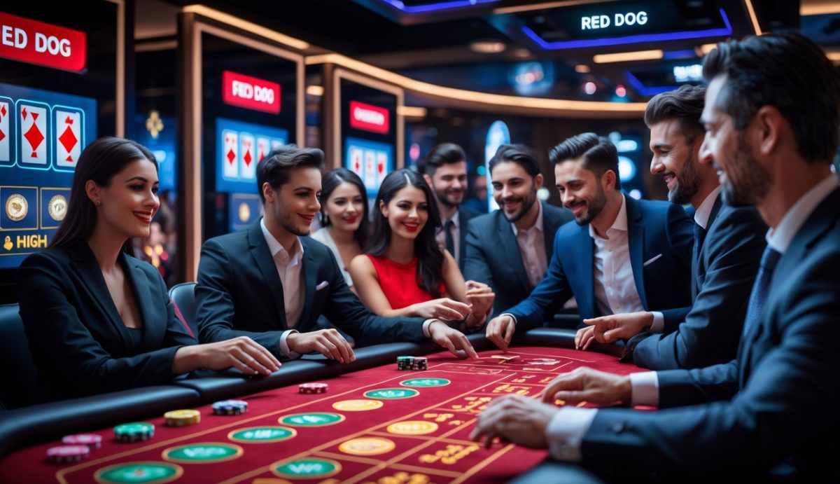 Sejumlah pemain duduk di meja kasino online dengan layar besar menampilkan permainan kartu Red Dog, suasana ceria dan profesional.