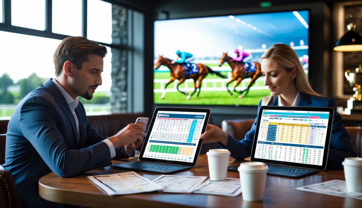 Dua orang sedang melihat data balap kuda di tablet dan laptop di sebuah bar olahraga dengan layar besar yang menampilkan balapan kuda langsung.