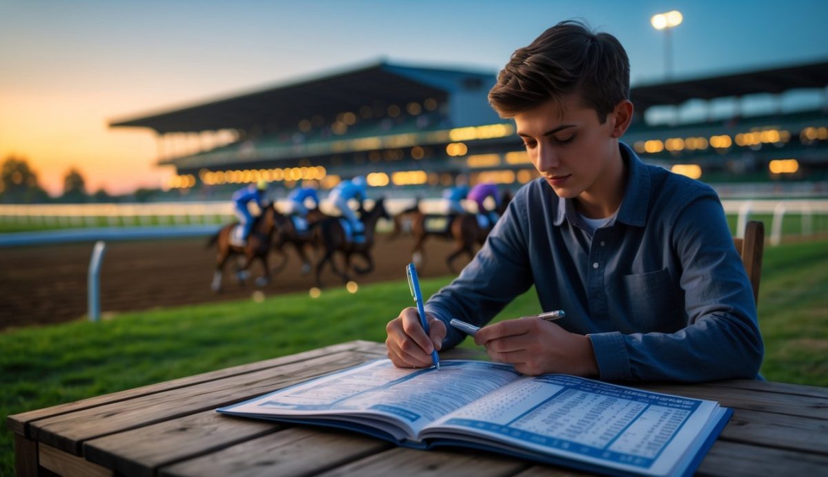 Seorang pemula sedang mempelajari prediksi balap kuda malam hari di dekat arena balap dengan latar belakang kuda dan joki yang sedang pemanasan.