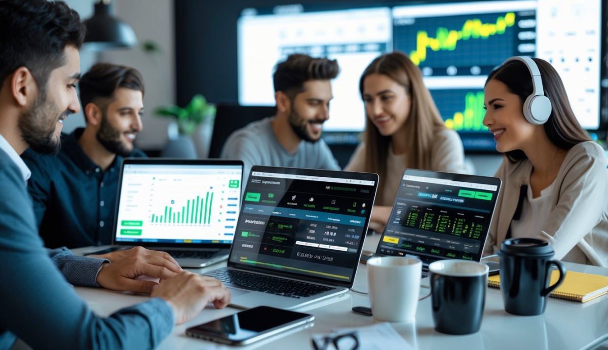 Beberapa orang sedang menggunakan perangkat digital untuk taruhan olahraga online di ruang kerja modern.